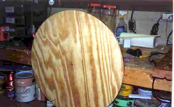 3/18 The big decision necessary here is to whether mold the gear on the existing ground board or go with a new ground board. Starmaster scopes use a circular ground board and all that would be necessary would be to cut the groove into the edge. In keeping with one of the design considerations, that of keeping the scope as stock as possible, the decision to make a new ground board was an easy one. We spent a couple hours today cutting out and grooving a new ground board/gear. This is made out of a 1/2 sheet of 3/4" B-C plywood. As with the altitude sector, it was cut on a 10" bench mount table saw.