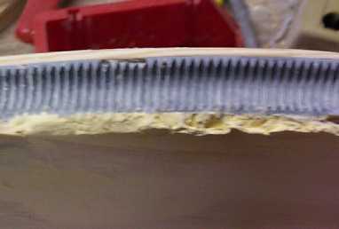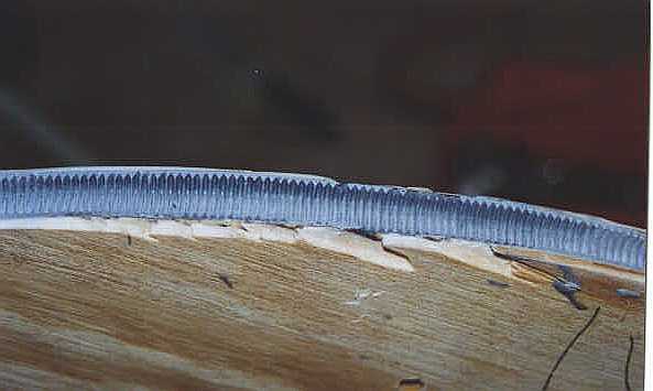 With a circular piece, it was necessary to have the edge of the board flat on the top of the saw table. This makes it impossible to set the depth and angle of cut before the blade enters the wood. This time a preliminary groove was cut with a small, battery operated Skilsaw. I would have been quite unable to perform this operation, but it looked easy when done by the skilled hands of Harry. He set the saw to the approximate depth and angle of cut and cut about 4 inches of groove while holding the saw in his hand. We were then able to lower this groove onto blade of the table saw and make the final 360 degree cut. If this doesn't explain the operation clearly (which doesn't surprise me!), leave me e-mail and I'll try to do better. I can see two methods of attempting to mold this large gear. The altitude sector was done as one molding of approximately 40 inches. I can attempt to do the same thing - two 40" sections or attempt to make one long section of 72" and then a short section of 10 inches. Since the altitude sector came out so well, the first attempt will be by molding as large a section as possible and then filling in the remaining few inches with a second molding.