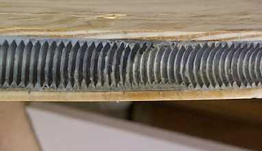 3/21 The second molding of the gear is underway. Will find out tomorrow if it worked or not. One problem I anticipated was getting the threads to match on both sides of the newly cast area. This turned out not to be a problem at all. Technique was to match the threaded rod with the cast threads on one side, secure the rod in place with tie wraps and then force the rod into the JB Weld. As I reached the other side of the gap, it was a simple matter to press the rod into the JB a bit - enough to get the threads to match. With a 13 pitch rod, you only have to adjust the rod by 1/26th of an inch to get the teeth aligned. The unset JB gives you plenty of latitude for this adjustment.